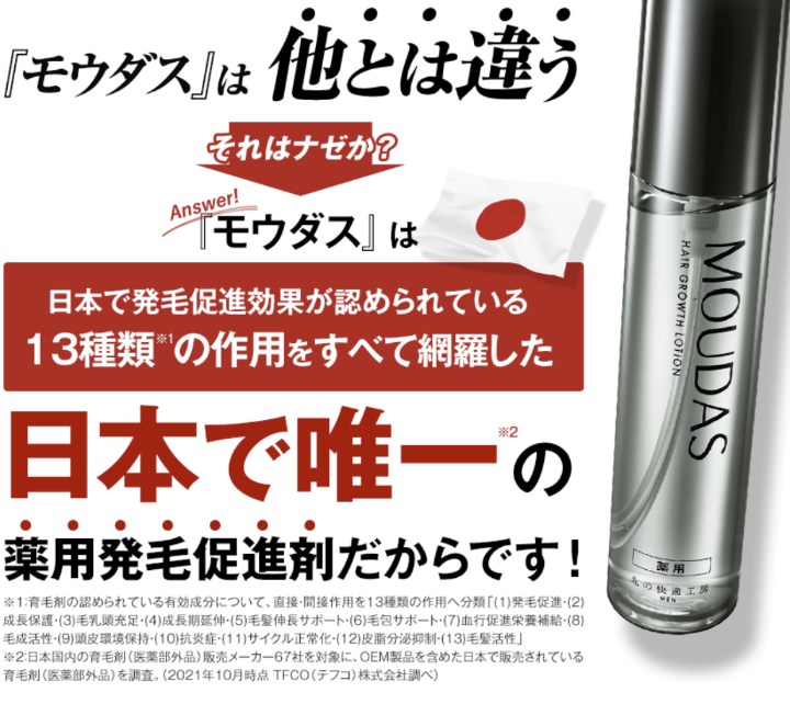 『モウダス』は、日本で発毛促進効果が認められている13種類(※1)の作用をすべて網羅した、日本で唯一(※2)の薬用発毛促進剤です。