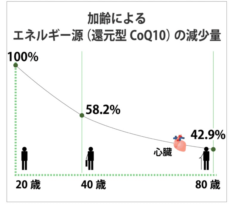 特に加齢によりエネルギー源が減っていくことが判明しており、例えば、下にグラフにより心臓のエネルギー源の変化をみると、加齢により極限状態に近づくことが分かっています。