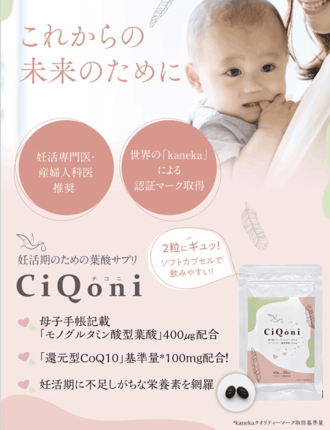 葉酸サプリCiQoniは基本は葉酸サプリですが、妊活期に不足しがちな栄養素11種類を網羅して、他社にはないCoQ10が配合されている点が注目できるサプリです。