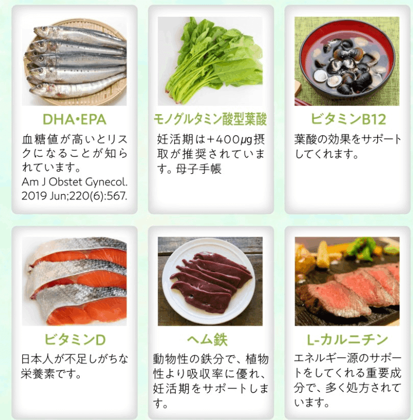 栄養面では、葉酸やDHA、ヘム鉄などの赤ちゃんの発育に欠かせない栄養素を摂取しましょう。