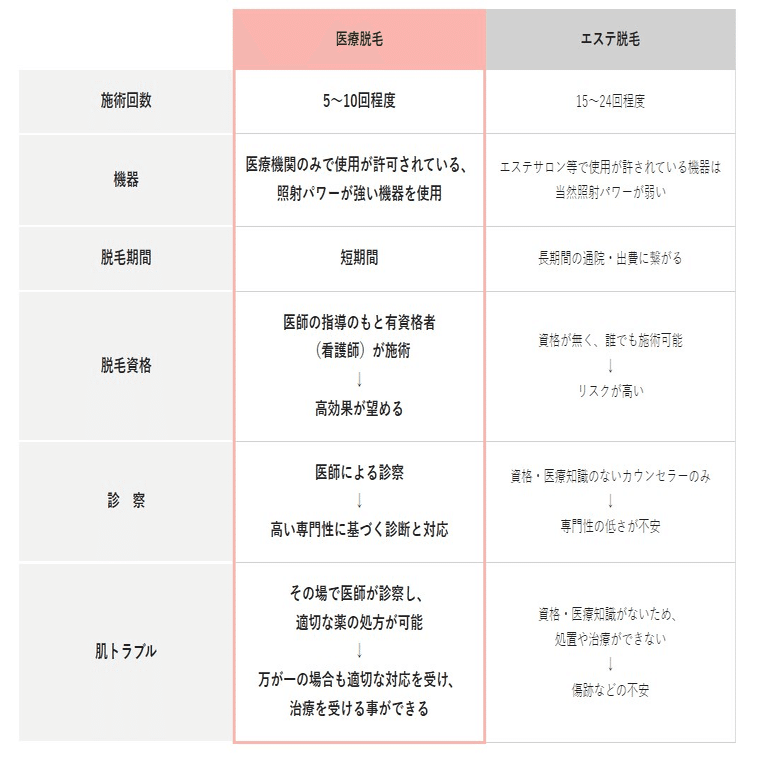 ちなみに医療脱毛とエステ脱毛と特徴は以下の通りです。